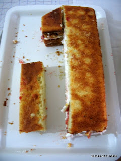 Here, I cut my sheet cake into 3 lengthways, stacked two layers together.