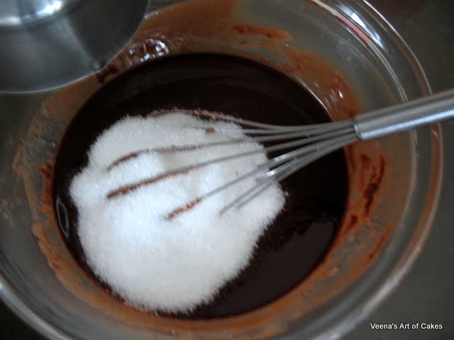Once melted add in the sugar and mix well. The heat in the chocolate mixture is enough to melt the sugar.