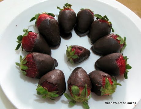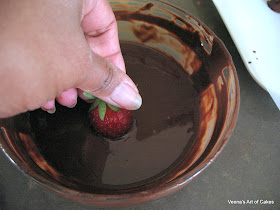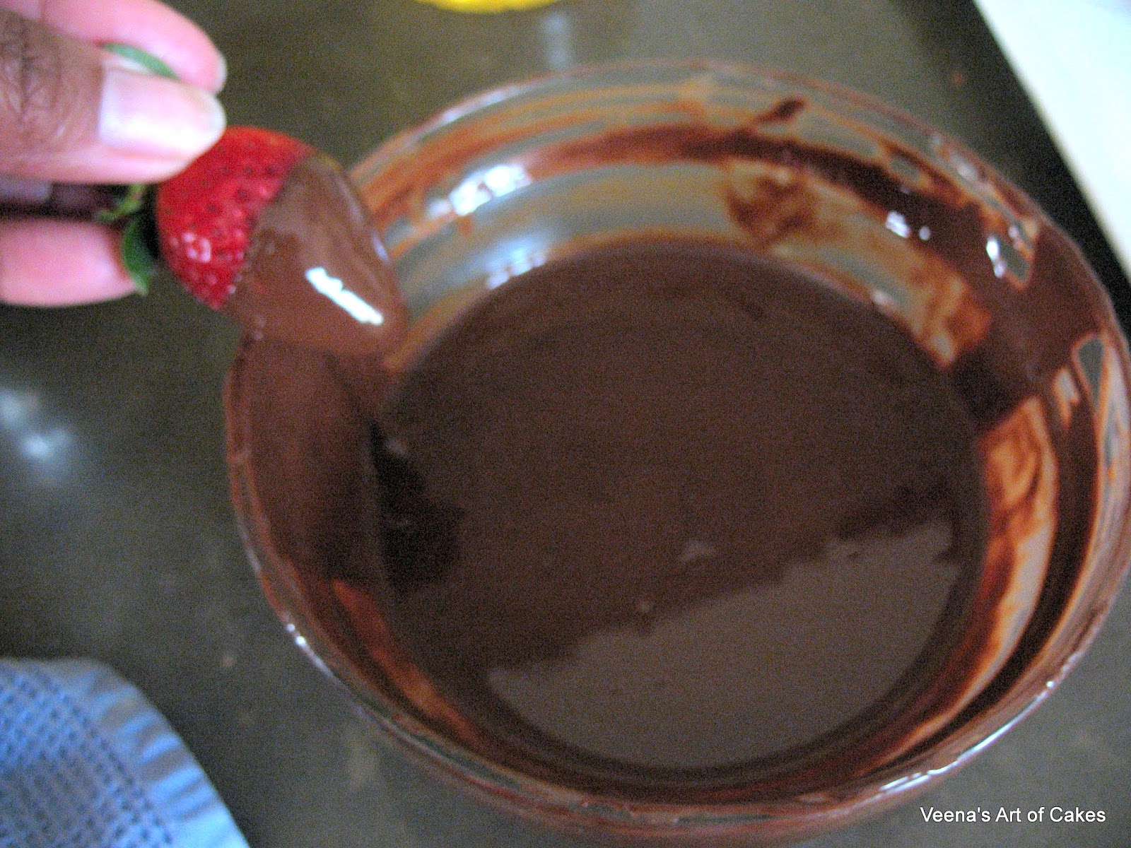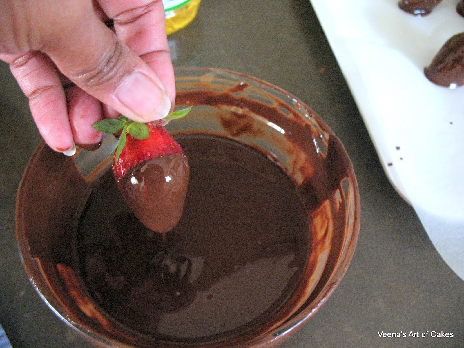 Now, pick a strawberry by the stalk (green) and dip into the chocolate.