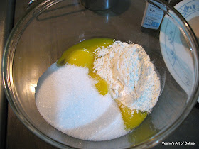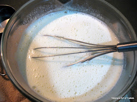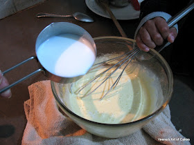 Now it's time to add the hot milk to the eggs slowly while stirring at the same time.