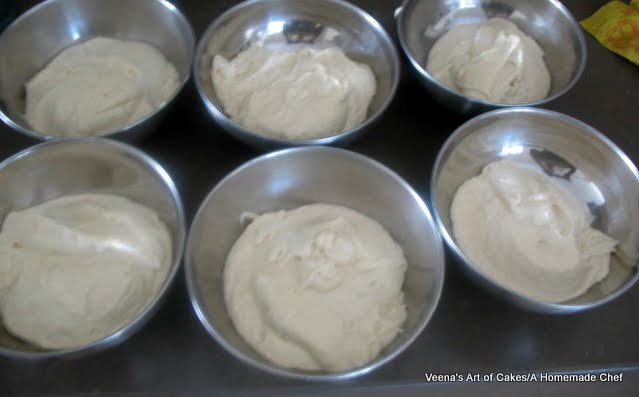 Divide you batter into six smaller bowls approximately.