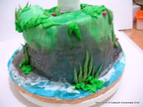 I use a thick paper to roll into a tapering roll and then used that as my template. Covered it with Gum paste to make the tower. Added the details such as black holes and black strips. When dry I removed the paper roll from inside. and attached it to a black gum paste disc on the bottom which was then covered with green grass. .